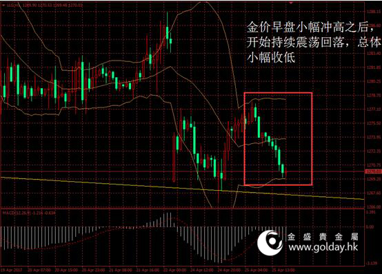 今日现货黄金开盘1275.46美元/盎司,截至北京时间下午5点30分,最高价格为1277.97美元/盎司,最低价格为1269.37美元/盎司。日内来看,金价早盘小幅冲高之后,开始持续震荡回落,总体小幅收低。午盘以后美元指数几乎同步走低,显示避险情绪仍在回落,消息面变动较小影响有限。