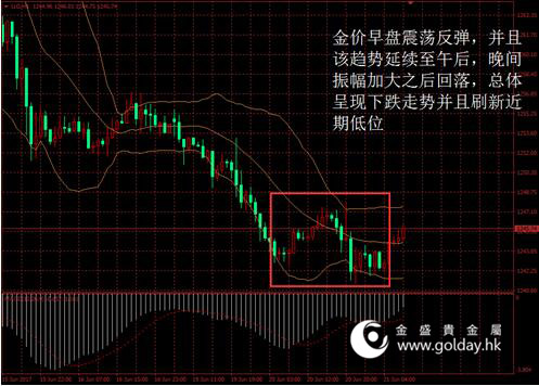上一交易日现货黄金开盘1243.68美元/盎司,最高1247.92美元/盎司,最低1241.15美元/盎司,收盘1242.83美元/盎司,收盘小幅下跌0.7美元,跌幅接近0。日内来看,金价早盘震荡反弹,并且该趋势延续至午后,晚间振幅加大之后回落,总体呈现下跌走势并且刷新近期低位。美元指数继续反弹,消息面多空互现,主要投资者持仓不变,技术面仍走弱。