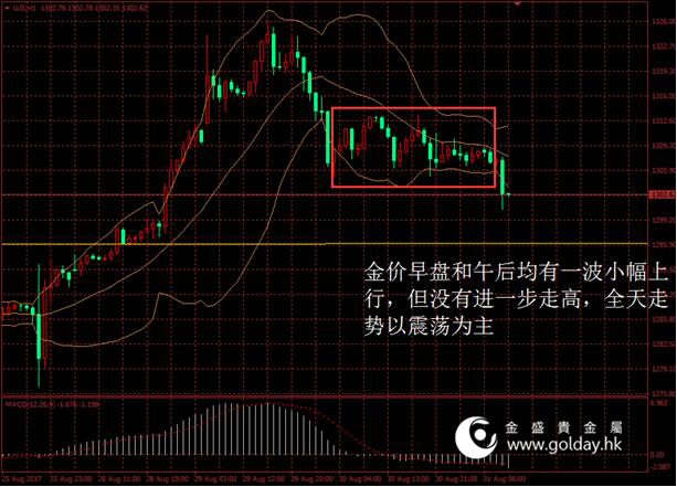 上一交易日现货黄金开盘1309.25美元/盎司,最高1313.33美元/盎司,最低1305.05美元/盎司,收盘1308.41美元/盎司,收盘微跌0.75美元,跌幅几乎为零。日内来看,金价早盘和午后均有一波小幅上行,但没有进一步走高,全天走势以震荡为主。美元指数从低位反弹,主要现货投资者仓位不变,消息面相对偏空,技术上看多头进一步上行力量减弱。