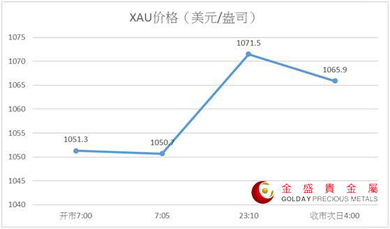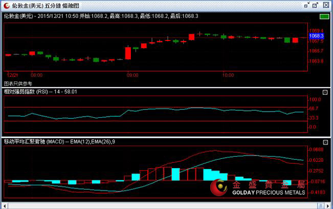 现货黄金周五(12月18日07:00am)开于1051.3美元/盎司,收于(12月19日04:00am)1065.9美元/盎司,最高(12月18日23:10)触及1071.5美元/盎司,最低(12月18日07:05)下探至1050.7美元/盎司。总体上涨14.6美元,涨幅1.38%。