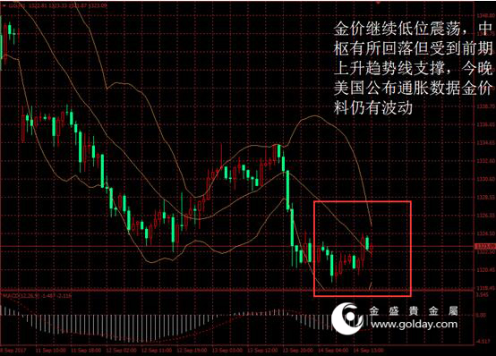 今日现货黄金开盘1322.98美元/盎司,截至北京时间下午5点40分,最高价格为1324.4美元/盎司,最低价格为1319.11美元/盎司。日内来看,金价继续低位震荡,中枢有所回落但受到前期上升趋势线支撑,今晚美国公布通胀数据金价料仍有波动。美元指数继续震荡,消息面仍保持平静,技术面上看多空平衡且等待方向选择。