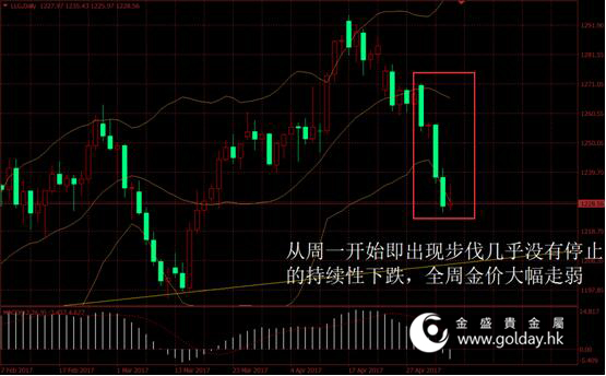 上周现货黄金开盘1270.57美元/盎司,最高1270.99美元/盎司,最低1225.59美元/盎司,收盘1228.56美元/盎司,全周金价大幅下跌38.93美元,跌幅3.07%。整体来看,从上周一开始即出现几乎没有停止的持续性下跌步伐,全周金价大幅走弱。消息面上也以利空因素为主,美元指数反弹后回落,对金价的支撑作用不明显。
