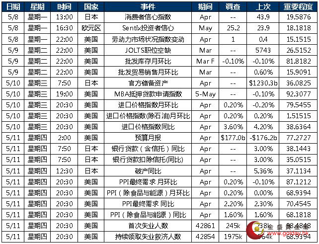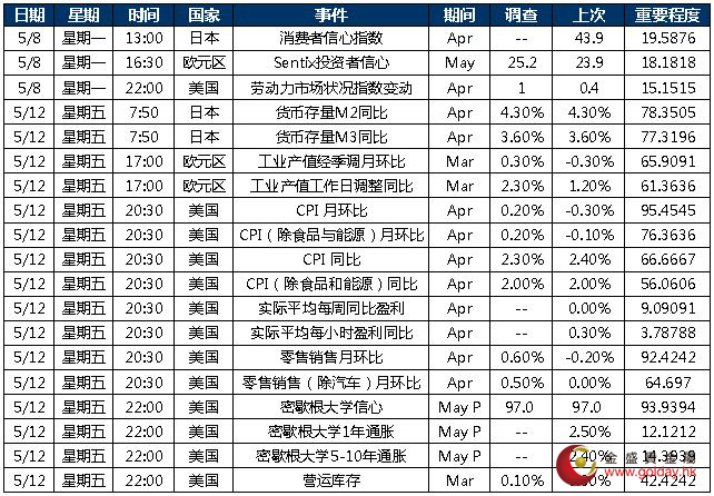本周公布的重要数据包括:美国4月CPI、消费数据等。