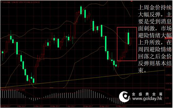 上周现货黄金开盘1229.01美元/盎司,最高1264.89美元/盎司,最低1226.87美元/盎司,收盘1254.21美元/盎司,全周金价反弹26.41美元,涨幅2.15%。整体来看,上周金价持续大幅反弹,主要是受到消息面刺激,市场避险情绪大幅上升所致,在周四避险情绪回落之后金价反弹则基本结束。美元指数大幅下行至特朗普当选总统后,也是半年多以来低位。