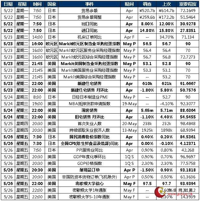 本周公布的重要数据包括:美欧日的PMI指数,美国房地产销售、耐用品订单,以及日本CPI数据。