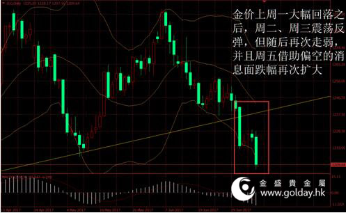 上周现货黄金开盘1241.53美元/盎司,最高1241.87美元/盎司,最低1207.16美元/盎司,收盘1209.64美元/盎司,全周金价大幅回落31.16美元,跌幅2.51%。整体来看,金价上周一大幅回落之后,周二、周三震荡反弹,但随后再次走弱,并且周五借助偏空的消息面跌幅再次扩大。美元指数冲高回落,消息面则为偏空,现货持仓资金大幅流出,技术面进一步走弱。