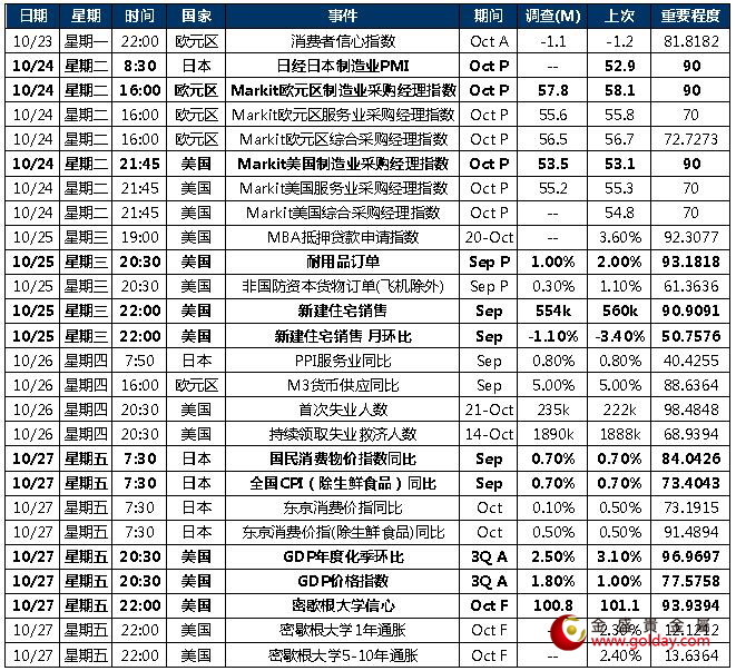 本周公布的重要数据包括:美、欧、日的PMI数据,以及美国第三季度GDP,尤其后者需要重点关注。