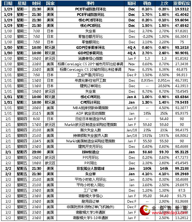 本周重点关注的数据包括,欧元区去年四季度GDP和1月CPI增速,美国12月PCE和1月非农以及官方PMI。