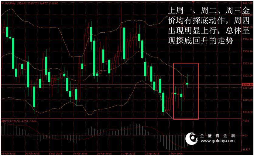 上周现货黄金开盘1314.76美元/盎司,最高1325.76美元/盎司,最低1304.15美元/盎司,收盘1319.80美元/盎司,全周金价上涨5.34美元,涨幅0.41%。整体来看,上周一、周二、周三金价均有探底动作,周四出现明显上行,总体呈现探底回升的走势。美元指数冲高回落,黄金期货和现货投资者持仓量变动较小,消息面上看多空不一总体略有偏多。技术面上看1300美元上方的支撑力量再次显现。