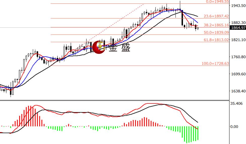 日线图,前三个交易日,行情弱势反扑,走势在小时图形成上涨通道,周四冲高回落回吐前三日全部涨幅。均线系统拐头向下,运行在价格上方。MACD指标快慢线零轴上方现死叉,做空的动能为主,指标回落零轴附近。行情维持上涨趋势,自1960美元一带的调整,回吐前一波上涨段的38.2%,回调空间相对偏小。目前多空在1860美元一带陷入争夺,一旦此处能止跌企稳,则价格偏向反抽千九一带,反之,将测试下一个支撑位,即图示黄金分割位50%的1840美元一线。