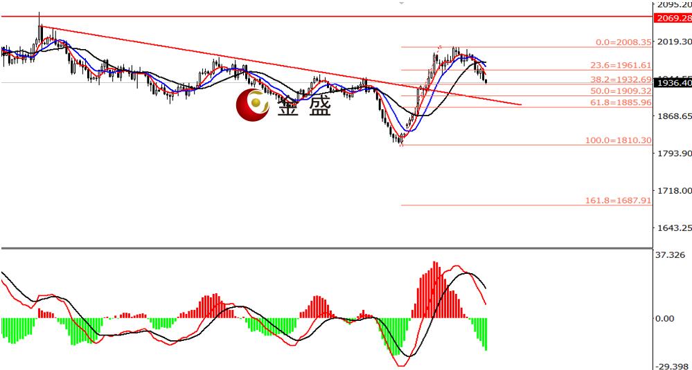 日线图,前半周黄金连续阴线下行,价格失守1960美元一带,走出高位震荡结构;周四略有反抽,周五再度下挫创周内低点。均线系统收敛向下拐头,短期均线压制价格上行。MACD指标快慢线零轴上方现死叉,做空的动能增强。黄金连续两周调整,回吐前一波涨幅的38.2%。目前K线还未止跌,下方强支撑位看图示黄金分割位50%附近,即1910美元一带。从时间周期来看,本周如继续调整,则是上行后的第三周回落,这是趋势行情中一个重要的转折时间节点。MACD指标或将完成对零轴的回归,这些因素共振,价格容易形成阶段性低点,故而重点留意K线止跌后的博多机会。