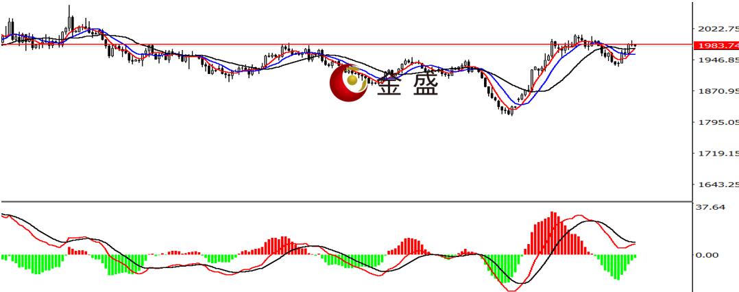 周线图,黄金未继续下行,盘中回踩上周低点止跌回升,盘中一度刷新近两周的新高,当周波动逾六十美金,最终收阳线。均线系统收敛,价格回落至布林带中轨附近。MACD指标快慢线回落至零轴一带,快慢线出现金叉,做多的动能减弱。黄金回踩布林带中轨出现较强反弹,确认1930美元一带支撑有效。近两周形成孕线结构,短期盘面或进入震荡,操作上回调低吸为主。