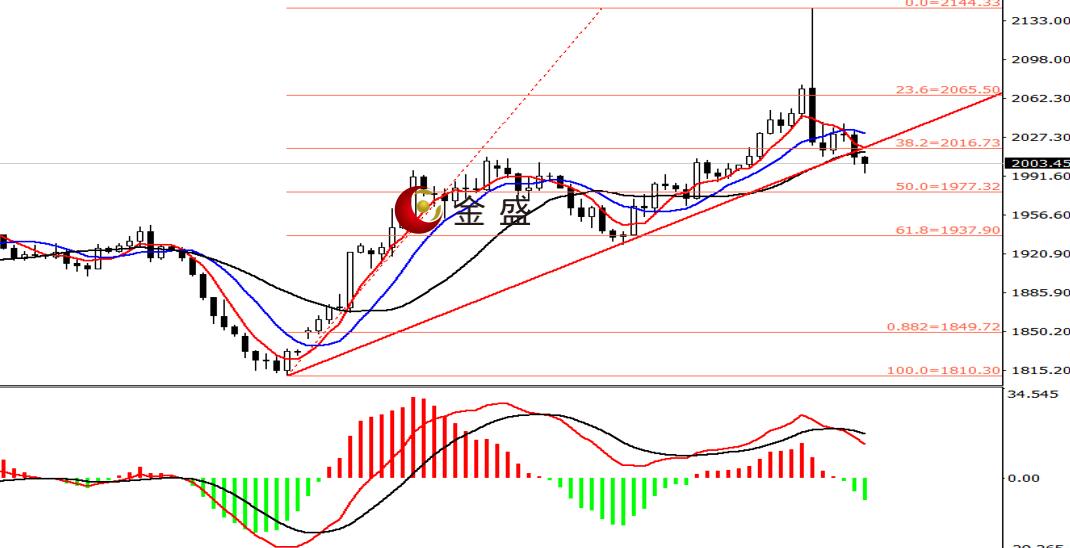 日线图,周一盘口宽幅巨震,价格先涨后跌波动逾一百美金,盘中创历史新高2144美元,随后震荡下行;周五非农数据利空,黄金再度走低,价格一度失守两千大关。均线系统不断收敛并向下拐头,运行在价格上方形成阻碍。MACD指标快慢线零轴上方现死叉,做空的动能为主。指标确认顶背离。黄金上行趋势不变,但短线空头力度强劲,价格跌破图示的支撑线,即确认调整空间加大。目前价格还未止跌,自1810美元开始的上行波段的黄金分割位如图所示,下方强支撑位看1980美元一带,操作上反弹做空为主,低吸为辅。