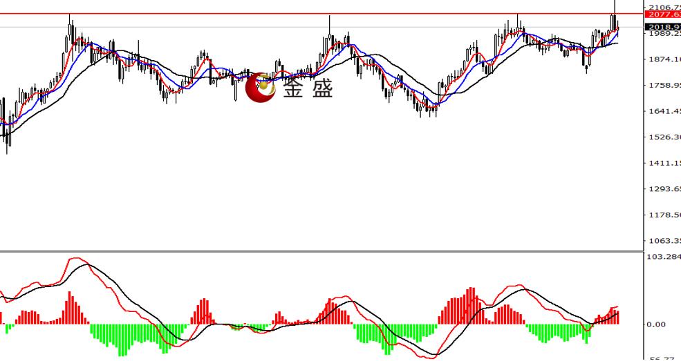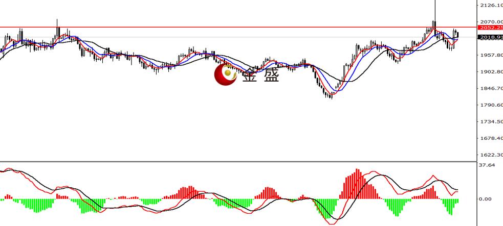周线图,黄金先跌后涨走V字型,价格重新站上两千美元大关,当周波动逾七十美金,周线收有影线的阳K。均线系统收敛拐头向上,价格回踩十周期均线。MACD指标快慢线零轴附近现金叉,做多的动能为主。黄金周线压力位阴包阳,确认反转信号,但周线上行结构未改变。本周回踩均线支撑有反弹,属于正常技术性反抽确认上方压力,后市重点留意2070美元一带的压力,操作上高抛低吸。