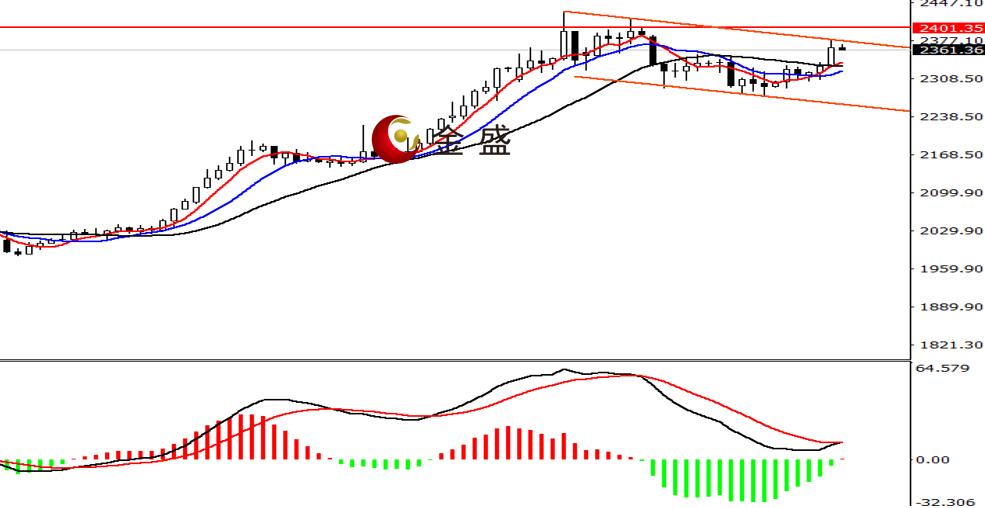 日线图,五个交易日三天收阳,周一持续走高突破非农高点,随后窄幅横盘两日,周四突破2330美元关口,确认反弹升级,周五加速走高至2380美元一带。均线系统收敛走平,运行在价格下方形成阻碍。MACD指标快慢线零轴上方有拐头迹象,做空的动能衰竭,指标完成对零轴回踩。黄金上涨趋势不变,价格两次回踩2290美元一带形成双底结构转涨,高位调整相比前一波涨幅,回落空间不大。日图的调整形成图示的通道结构,周五上行至通道上轨有调整,下周前半周关注通道上轨真假突破,一旦站上,则价格偏向测试2400美元一带压力。下方2330美元一带是强支撑位,操作上高抛低吸。