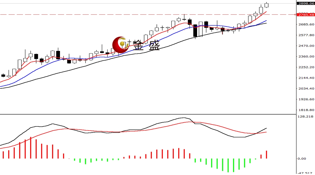 周线图,黄金延续涨势,价格突破前高2790美元一带出现加速上行,当周波动逾一百美金,创今年最大周内波幅,周线再收阳线。均线系统多头排列,运行在价格下方形成支撑。MACD指标快慢线零轴上方现金叉,做多的动能增强。黄金上涨趋势不变,周线连续六周收阳,本周突破前高收中阳线,价格形成向上真突破的概率较大,后市偏向继续上行,操作上调整做多为主。