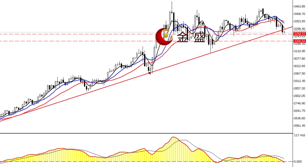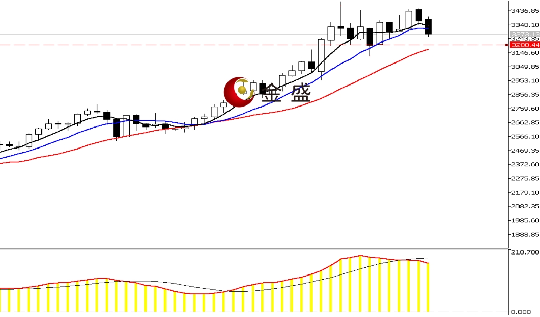 周线图,以伊冲突化解,避险资金退场,黄金承压继续调整,价格跌破3300美元大关,周线再收阴线。均线系统不断收敛,价格跌破短期均线。MACD指标快慢线零轴上方现死叉,做空的动能增强,指标超买有调整需要。黄金上涨趋势不变,行情进入高位震荡。价格连续两周回落,确认6月9日—6月13日当周的阳线为假突破。后市偏向回踩布林带中轨的支撑,操作上高抛低吸。