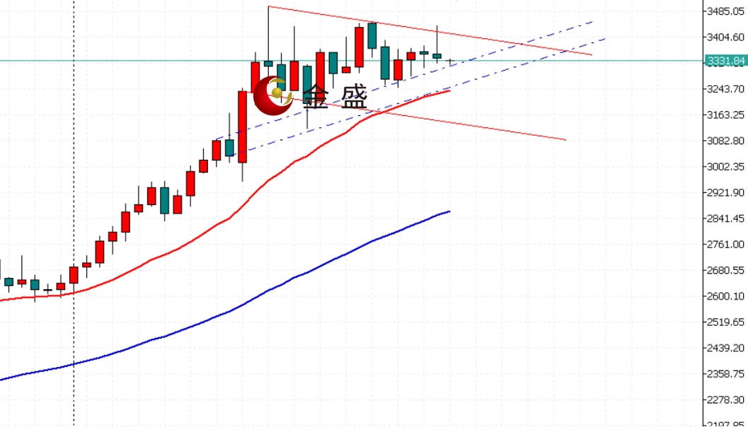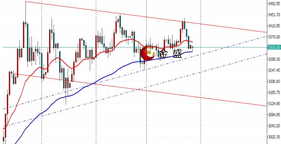 黄金周线级别继续保持震荡修正波动,从K线形态上看,行情形成旗形整理中的平行整理,从通道趋势上看,行情呈现以3500美元为高点的连接线的下行通道上轨压制的空头修正,从上行趋势线上看,行情保持在趋势线的支撑上进行测试,结合趋势线以及通道线,行情目前运行在窄幅三角形波动当中,从EMA技术指标上看,价格距离EMA20位置有小幅距离,但上行的趋势线的分水岭和EMA技术指标有重叠迹象,表明行情进入关键选择方向时刻,静候破位区间的打开。