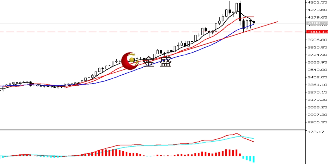 日线图,黄金周一创历史新高;周二多头获利了结,金价大跌逾5%;周三金价回踩四千止跌反抽,后续两日以震荡为主。均线系统不断收敛,价格回踩布林带中轨。MACD快慢线零轴上方现死叉,有调整需要。黄金趋势不变,价格运行在图示的趋势线。周内反抽前高4380美元关口出现跳水走势,高位下杀的空头力度有增强,确认短期高点形成,行情要进入暴涨后的休整,具体的整理形态还需时间观察。短期四千关口不失守,则下行空间受限,操作上低吸为主。