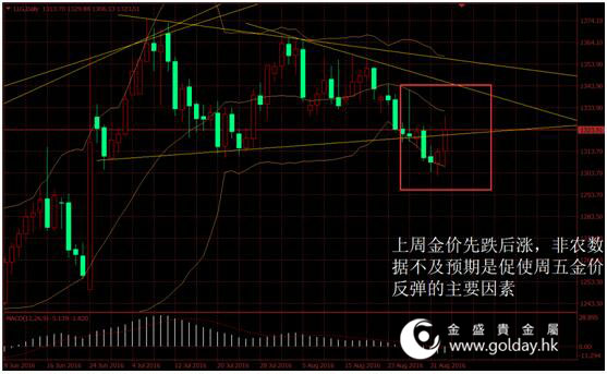 上周现货黄金开盘1319.73美元/盎司,最高1329.88美元/盎司,最低1302.31美元/盎司,收盘1323.51美元/盎司,全周金价小幅上涨2.78美元,涨幅0.21%。整体来看,上周金价呈现出触底反弹的走势,周初在市场预期美联储9月升息可能性上升的情况下,金价承接上周走势继续下行,周五则在非农数据低于预期的情况下出现反弹。
