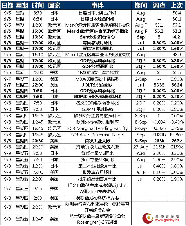 美联储方面,截至9月2日当周美联储官员,包括副主席Fischer在内的发言全部为鹰派或偏鹰派。而从市场角度看,周五非农数据之后,联邦基金利率期货推算的9月升息的概率回落至21%,12月之前升息至0.75%的概率则略微回落至41.1%。综合来看,我们认为之前联储官员一直强调的就业出现的波动,使得9月升息的可能性进一步下降,但是12月升息可能性仍存在,美元指数进一步上冲的动力下降,非美资产承压缓解,黄金多头暂时安全。