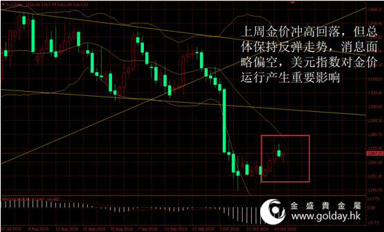 上周现货黄金开盘1251.94美元/盎司,最高1274.13美元/盎司,最低1250.40美元/盎司,收盘1267.33美元/盎司,全周金价上涨14.76美元,涨幅1.18%。整体来看,上周金价整体走势反弹,前三天在美元指数上行遇阻情况下展开反弹,但是周四周五美指重新上攻压力线,金价应声回落,消息面变动不大,对金价总体略偏空。