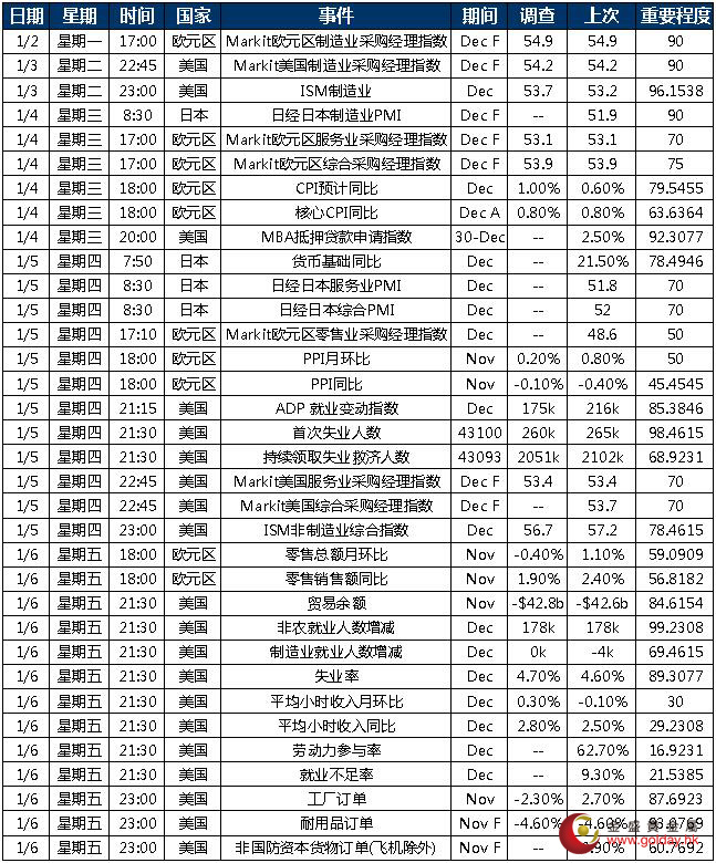 本周重要数据为周五的美国非农和失业数据。此外需要注意的是,周一由于受到元旦假期影响,欧美主要金融市场将继续休市。