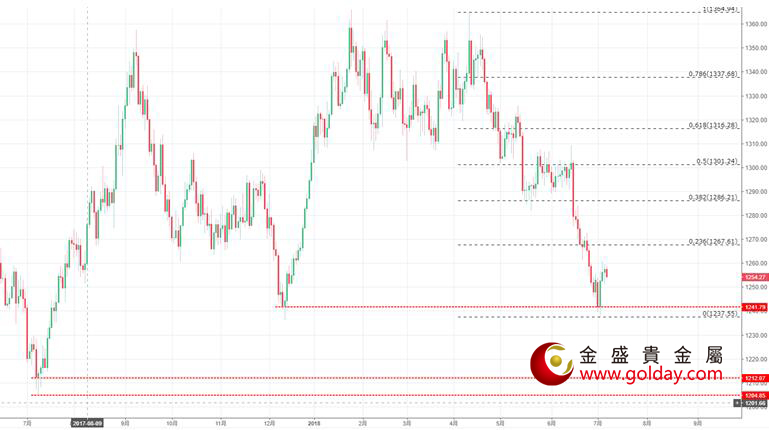 现货黄金上一交易日(7月5日)亚市早盘开盘于1256.98美元/盎司,最高1259.64元/盎司,最低1251.12美元/盎司,收盘1257.53元/盎司,收盘小幅回落0.48美元,跌幅为0.04%。