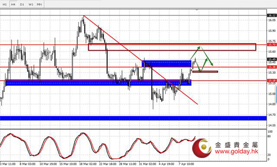 国际现货白银本周一(4月11日)亚盘开盘同样出现跳开动作,出现向上拉升,欧盘维持拉升格局,和黄金不同的是截止目前,白银并没有出现回落迹象。晚间要小心又进一步的冲高,稳健看来,对于日内短线的朋友,可以上方选择在15.60-15.70区间建仓空单,若出现回落,关注下方15.34-15.40区间的支撑,若能有效支撑,可以考虑进场多单。