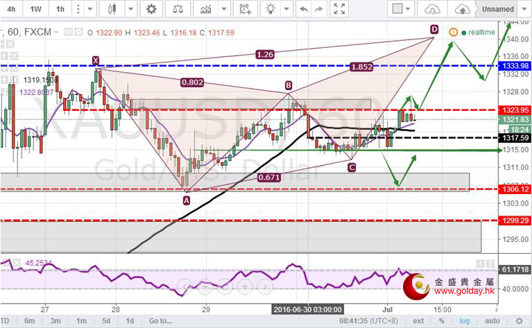国际现货黄金周四(6月30日)亚盘小幅回落,欧盘延续震荡走势,美盘小幅上涨。关注高位的三角形震荡区间,相对于站稳1324-1326区间,上破颈线部位可以做多,目标看1330和蝴蝶星套1.27的外部扩展1340美元/盎司,到达1340美元/盎司做空,目标1330美元/盎司。下方若下破1315美元/盎司可以做空。