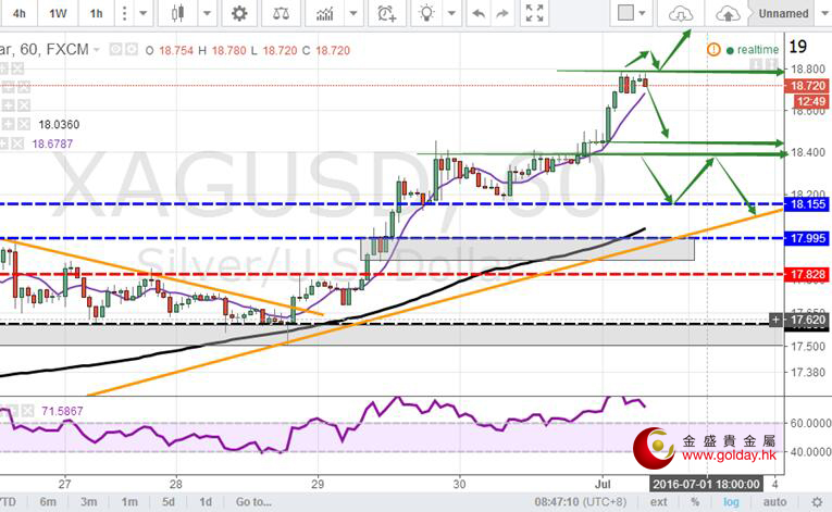 国际现货白银周四(6月30日)亚盘小幅冲高震荡,欧盘基本延续震荡走势,美盘继续大幅冲高,最高点触及18.80美元/盎司,若能上破18.80可以做看19美元/盎司,或者选择在19整数关口做空。下方回踩点位关注18.40美元/盎司附近的支撑。若能下破18.40美元/盎司,那么这波大幅拉升也就基本结束了。目前多头太强,可以适当观望。