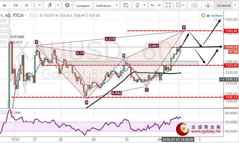 国际现货黄金周五(7月1日)亚盘小幅上冲,欧盘延续冲高走势,美盘小幅上涨。目前已经站稳在1324美元/盎司上方,上破颈线部位后目标看蝴蝶形态1.27的外部扩展1340美元/盎司,到达1340美元/盎司做空,目标1330美元/盎司。若回踩在CD段的0.382或0.5一线获得支撑,可以看继续上涨。下方若下破1315美元/盎司可以做空。