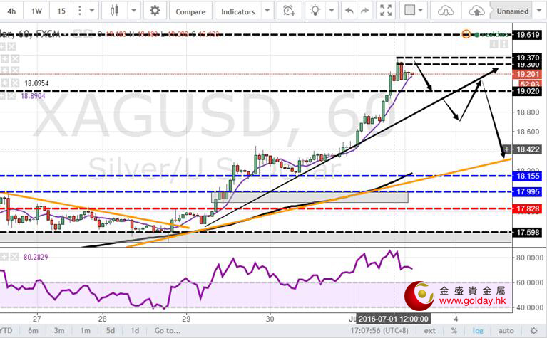 国际现货白银周五(7月1日)亚盘小幅冲高震荡,欧盘进一步上冲,突破19整数关口,最高点达到19.37美元/盎司。现在的价位按照扩展基本都达到极限了,不要进场追多。如果有反弹给到19.30-19.37区间的机会,可以尝试空单,止损就放19.40一线。从大周期看,在19.20-19.60区间是白银比较重要的阻力区间。