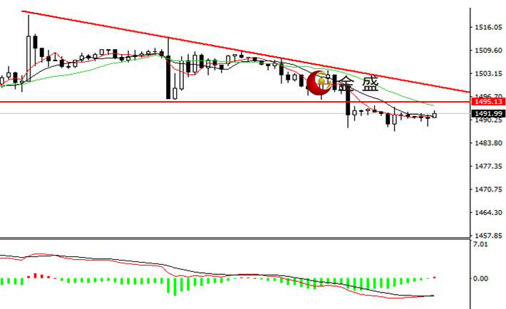 前一个交易日,行情大跌超20美金,价格跌破两日盘整结构低点,回落至1460—1519区间的50%,今天亚盘行情回踩昨日低点再次出现快速反弹,即二次确认1488附近的支撑有效,多头在守住关键位置的情况下,并未扩大反弹空间,而是以横盘整理为主。小时图呈现图示的下降三角形,价格只有突破下降压力线,行情或再次上涨。均线系统偏空头排列,MACD指标快慢线运行在零轴下方有现金叉迹象,动能由空翻多,日内操作高抛为主。