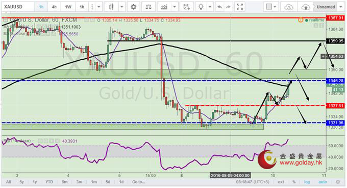 国际现货黄金周二(8月9日)亚盘和欧盘小幅震荡下跌,再次测试1330美元/盎司一线的支撑,后小幅拉升,美盘最终向上突破1338美元/盎司,突破下方震荡区间,并且在突破1338美元/盎司后给到回踩做多的机会,目标1346美元/盎司。也就是说多单应该离场了,1346-1350美元/盎司区间没破之前,该区间考虑做空,除非突破1350再考虑做多目标1360美元/盎司。