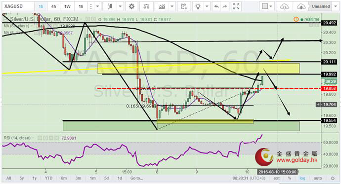 国际现货白银周二(8月9日)亚盘和欧盘小幅震荡下行,后出现小幅拉升。美盘盘初延续下行,回踩19.55美元/盎司附近,给到我们进场做多的机会。顺利完成19.85第一目标,突破0.382后,目标看20.00-20.11美元/盎司区间,目标已经完成,多单应该离场了,除非之前头肩顶颈线部位上破,否则下方先考虑做空为主。