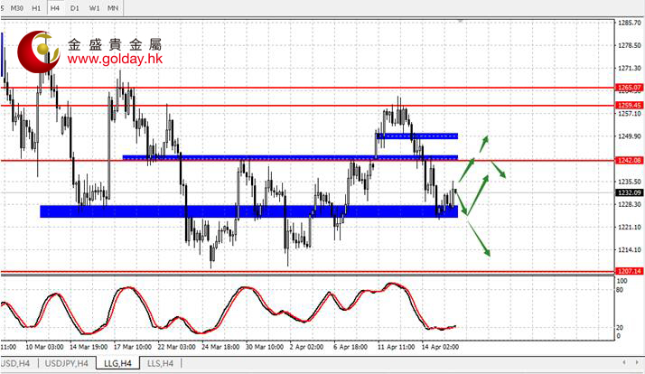 国际现货黄金上周周五(4月15日)亚盘盘初重新回踩下方1225美元/盎司一线,后止跌企稳,小幅震荡上行,欧盘维持震荡走势,美盘波动加大,快速回落后快速拉升。最终上周收报1233美元/盎司。关注下方1224-1228的支撑情况。目前看支撑表现良好,上方关注1240一线,如果出现反弹,只要不破1240短期结构依然偏空,如果上破,可能会有进一步的上涨空间。