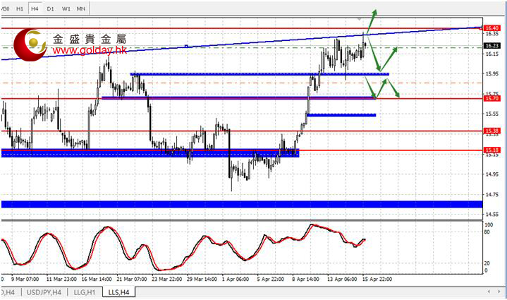 国际现货白银上周周五(4月15日)亚盘维持高位震荡走势,盘初有小幅回落,欧盘再度小幅震荡上行,美盘出现进一步冲高回落,刷新日内高点到16.36美元/盎司,最终收于高位16.23美元/盎司,也可以说刚好达到上方阻力位没有突破后出现小幅回落。所以截至目前白银短期依然处于偏多格局中,但需注意白银短期回落风险加大。关注日线级别上方趋势线是否破位情况。