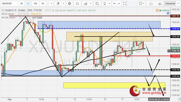 国际现货黄金周四(8月18日)亚盘再度拉升,测试1355美元/盎司附近区间的阻力,最高点触及1356美元/盎司一线。欧盘震荡下行,美盘小幅拉升转而下行。上方依然关注阻力1355美元/盎司附近以及1360美元/盎司一线。正常来说1355美元/盎司的空单应该已经进场,继续持有。下方关注1343和1330-1334美元/盎司区间。