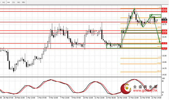 国际现货白银周二(3月22日)昨日同样冲高回落,正好打在我们给到大家15.95-16.00的做空区间,短线下行风险有所上升。不过15.70的支撑昨日并没有破坏掉,相比之下,白银的下行风险较黄金来得要相对偏小。昨日的白银冲高给我们带来一个潜在的蝙蝠形态,如果形态形成,白银D点的外部扩展点位0.886正好是下方15.30-15.20支撑区间的高点。所以日内依然要重点关注下方15.70颈线部位支撑是否能够下破。如果日内给到反抽昨日二次冲高高点,依旧可以小止损布局空单。
