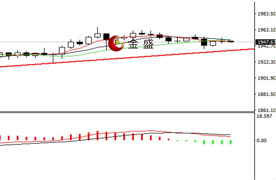 前一个交易日,黄金白盘区间整理,晚盘单边走高,价格一度突破1960关口,尾盘出现快速回落。今天日内以震荡下行,调整深度正好是昨日美盘单边上涨的61.8%,价格未有效跌破图示的趋势线,均线系统收敛,MACD指标快慢线在零轴上方运行,做空的动能为主,小时图出现明显的ABC三浪上涨结构,晚间关注趋势线的破位与否,一旦失守则关注1920一线支撑,上方强压力参考1980一线,操作上高抛低吸。