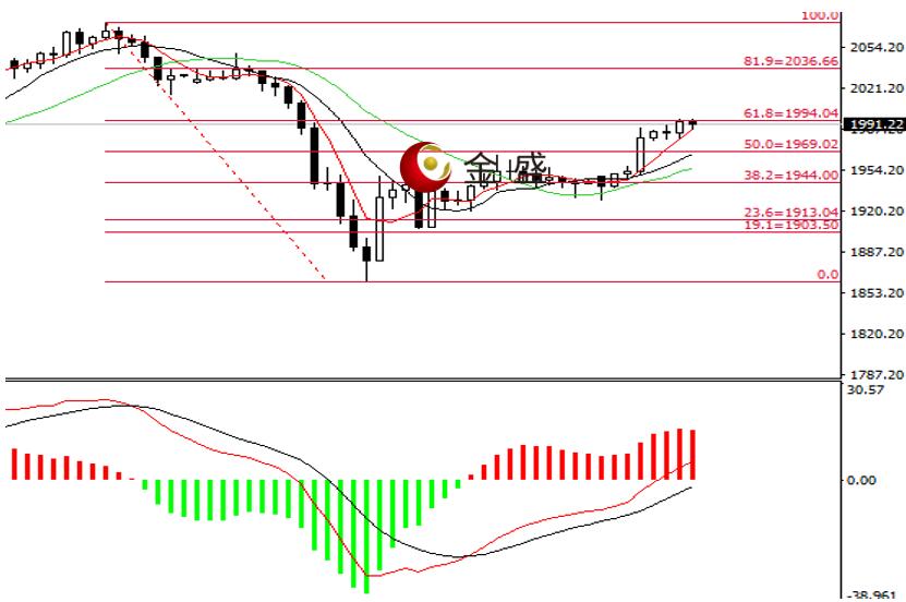 前一个交易日,黄金早盘高开低走,下行超二十美金,价格回落至1930一线止跌,行情开启单边上涨,晚间基本面消息刺激金价加速上行,全天波动超60美金,今天早盘行情延续强势,价格调整不破1980,随后向上测试前一波调整的61.8%,价格已突破2000大关。均线系统拐头向上,MACD指标快慢线在零轴附近运行,做多的动能为主,四小时图目前属于三浪上行过程中,操作上回调低吸为主。
