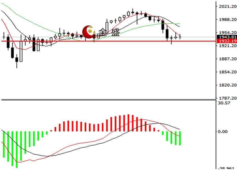前一个交易日,黄金全天表现疲软,价格跌破1980一线出现加速下行,凌晨延续跌势,日内下挫超70美金,价格回落至图示的水平支撑位出现止跌信号,今天日内偏向反抽,但高度不及昨日下跌幅度的一半,多头动能偏弱。均线系统拐头向下,MACD指标快慢线在零轴附近运行,做空的动能为主,操作上高抛为主。