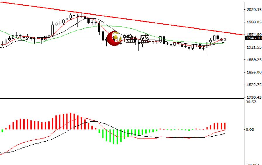 前一个交易日,行情白盘震荡下行,盘中最低至1902一线,随后迅速拉升,一个小时上涨超二十美金,多头力度增强,小时图连阳八根K线,价格回到区间上轨一带,美盘拉升空间超五十美金,今天日内行情以调整为主,回落幅度不大,盘中短暂刺破1940关口,均线系统拐头向上,MACD指标零轴下方水平运行,做多的动能为主,短期上行压力位在1655—1960,操作上调整做多为主。