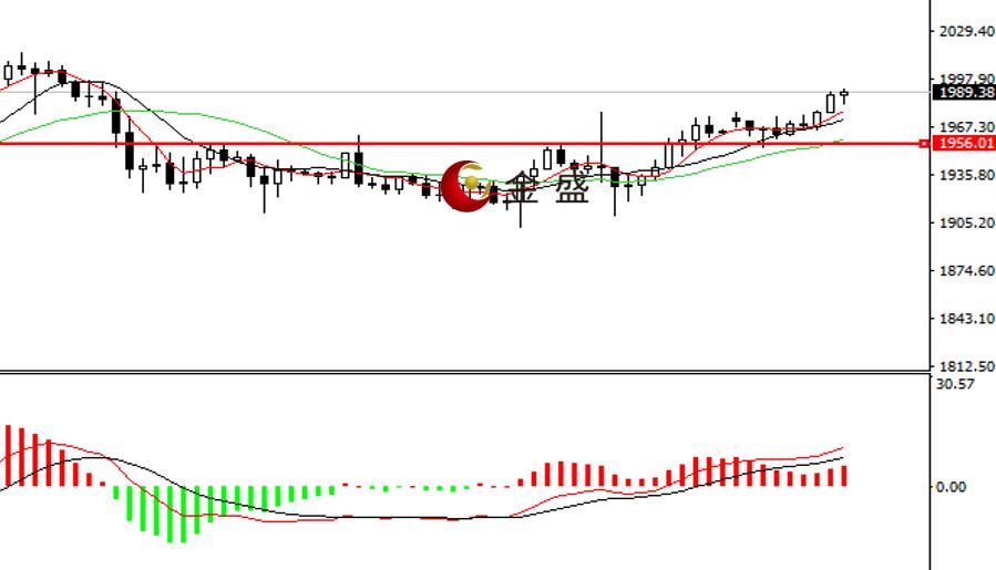 前一个交易日,白盘行情高开短暂冲高至1976一线,随后回落至1955一带止跌回升,晚间多头再次受阻日内高点陷入整理。今天早盘,美指延续跌势,白银再次拉升走新高,黄金多头发力突破关键压力位1976一带,随后上行明显加速,均线系统拐头向上,MACD指标零轴上方运行,做多的动能为主,操作上回调低吸为主,晚间关注二千一线的K线表现。