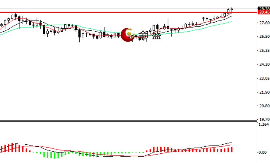 前一个交易日,白银走势强于黄金,白盘冲高回落至27.6美盘转升势,欧美盘呈现单边上涨,盘中涨幅一度扩大至3%。今天日内银价突破28.5美元的压力位,即四小时的圆弧底的水平口被突破,上行空间进一步打开,均线系统拐头向上,MACD指标在零轴附近运行,做多的动能为主,多周期均是多头看涨结构,操作上低吸为主。