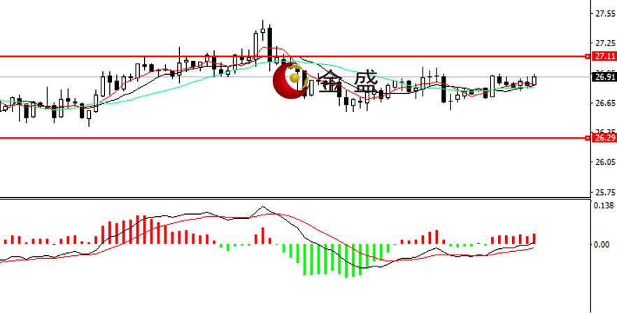 前一个交易日,白银走势与黄金类似,价格围绕区间整理,27关口形成强压力位。今天日内行情以震荡上行为主,价格运行在27美元下方。均线系统收敛,价格围绕其来回震荡,MACD指标在零轴下方现金叉,做多的动能为主,短期看26.4—27.1区间震荡,操作上高抛低吸。