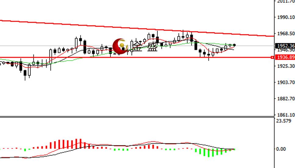 前一个交易日,白盘行情加速走低,价格回落至1940一带陷入震荡,晚间市场迎来巨额资金砸盘,价格向下走假突破,走势维持区间整理。今天日内行情向上突破结构,价格站稳1950一线。小时图的双顶颈线未对多头形成有效的阻碍,均线系统不断收敛,MACD指标零轴附近运行,做空的动能减弱,短期走势偏向震荡,且随着时间延长,下降三角形的压力线移动至1965一带,晚间关注这一带的真假突破。