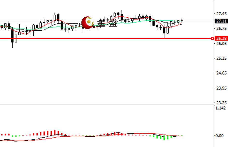 前一个交易日,白银走势与黄金同步,盘中出现两次脉冲下挫,日内振幅超3%,晚间大宗商品出现异动,白银先于黄金强势反抽,最终回到日内高点一线,全天走深V。今天日内行情延续上行,价格运行在27上方。均线系统收敛,价格围绕其震荡,MACD指标在零轴附近走平,做空的动能衰竭,第一压力位关注27.4一线。
