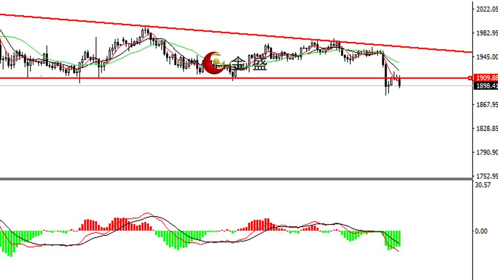前一个交易日,黄金上演单边下行,日内下跌超七十美金,价格回落至月图的五周期均线止跌反抽,盘中价格击破四小时结构的收敛结构。今天日内行情反弹至昨日下跌波段50%再次拐头,盘中跌破1900关口。均线系统拐头向下,MACD指标现死叉,做空的动能为主,昨日大跌,今天略有反弹,但上行空间有限,小时图二次回踩未明显止跌,操作上以做空为主。